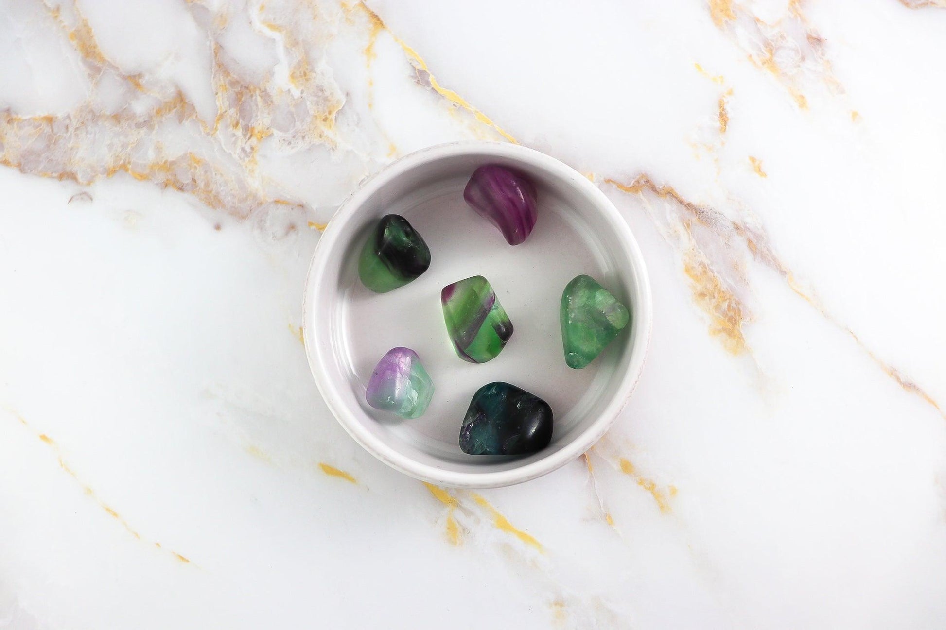 La fluorite multicolore combine les vertus de chaque couleur. Le vert représente la prise de recul, la compassion et le respect de ses propres valeurs. Le violet représente l’anticipation, la perspective et la création par l’esprit.